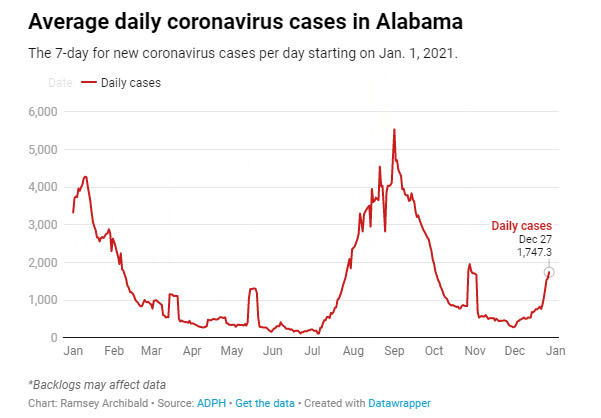 앨라배마주 공중보건부(ADPH)의 새 자료에 따르면, 지난 주에만 7일 평균 신규 환자수가 110% 증가했으며, 월요일 현재 하루 1750명의 신규 환자가 발생한 것으로 나타났다.