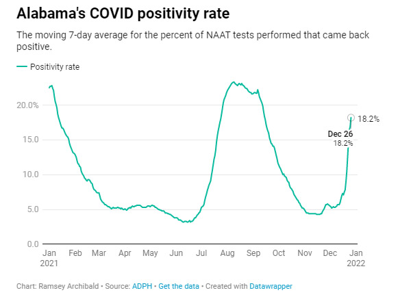 일요일 기준, 핵산 증폭 실험에 대한 앨라배마주의 확진률은 18.2%로 급증했다. 이는 지난 일요일보다 143% 증가한 것이다. 앨라배마주에서 가장 높은 확진률은 지난 9월 중순이었다.