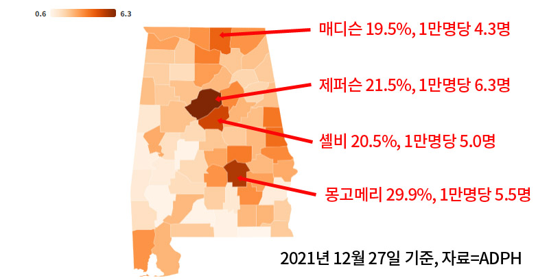 이 외에도 몽고메리, 셸비, 매디슨 카운티가 1인당 감염사례수에서 제퍼슨에 이어 2,3,4위를 차지하고 있다.