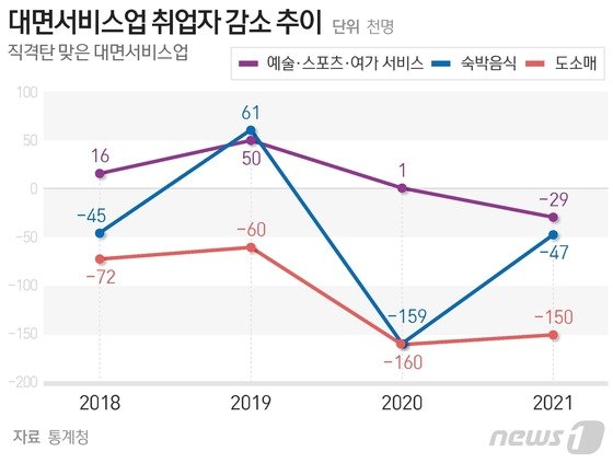 코로나19 확산이 시작된 2020년부터 작년인 2021년까지 2년간 주요 대면 서비스업에서의 취업자 증감을 보면 △도소매업 -31만명(2020년 -16만명, 2021년 -15만명) △숙박음식점업 -20만6000명(-15만9000명, -4만7000명) △예술·스포츠 및 여과 관련 서비스업 -2만8000명(+1000명, -2만9000명) 등이다.