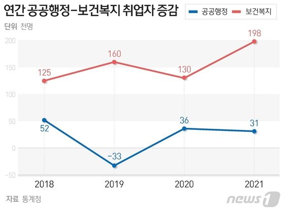 이는 정부가 추진한 재정지원 일자리사업 등에 힘입은 보건업 및 사회복지 서비스업(2020년 +13만명, 2021년 +19만8000명), 공공행정(+3만6000명, +3만1000명)과 뚜렷이 대비되는 모습이다.