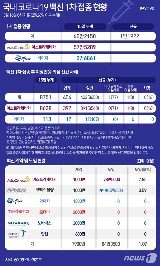 이 중 8638명이 1차 접종 후 이상 반응을 보고했고 16명이 사망했다. 보건당국은 사망 원인은 기저질환에 따른 것으로 백신과는 무관하다는 입장이다.