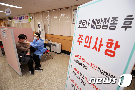 | 16일 오전 광주 동구청 보건소 2층에서 백신 접종 1차 대응요원으로 분류된 구청 공무원 등이 코로나19 아스트라제네카(AZ) 백신 접종을 받고 있다. 2021.3.16/뉴스1 © News1 황희규 기자 |