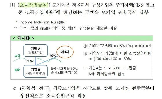 소득산입규칙은 그룹 자회사에서 미달 세액이 발생했을 때 이를 모기업이 ‘모기업 관할국’에 납부토록 하는 내용이다.