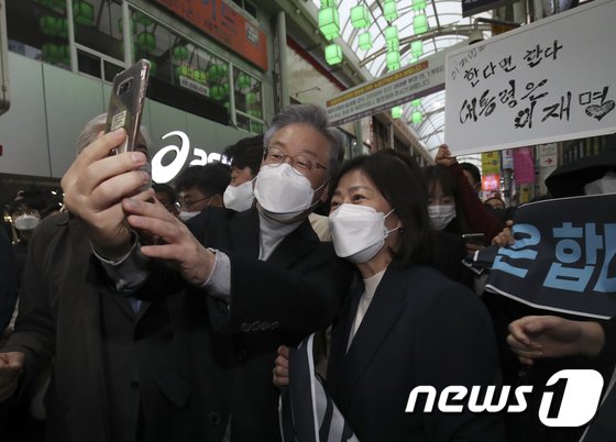 전국 민생탐방 투어에 나선 이재명 더불어민주당 대선 후보가 12일 오후 울산 중구 울산중앙전통시장을 찾아 시민들과 사진을 찍고 있다. 이 후보는 이날 부산·울산·경남을 시작으로 약 8주간 버스를 타고 전국 곳곳의 목소리를 경청하는 매타버스(매주 타는 민생버스) 프로젝트에 돌입했다. 2021.11.12/뉴스1 © News1 윤일지 기자