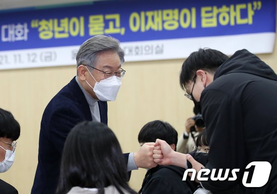 전국 민생탐방 투어에 나선 이재명 더불어민주당 대선 후보가 12일 오후 울산 남구 시의회 대강당에서 열린 ‘청년이 묻고, 이재명이 답하다’ 울산 청년들과의 대화에 참석하며 청년들과 인사를 나누고 있다. 이 후보는 이날 부산·울산·경남을 시작으로 약 8주간 버스를 타고 전국 곳곳의 목소리를 경청하는 매타버스(매주 타는 민생버스) 프로젝트에 돌입했다. 2021.11.12/뉴스1 © News1 오대일 기자