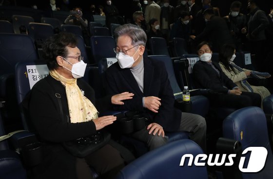 전국 민생탐방 투어에 나선 이재명 더불어민주당 대선 후보가 12일 오후 부산 중구의 한 극장에서 고 최동원 선수 모친 김정자 여사와 함께 영화 ‘1984 최동원’을 관람하고 있다. 이 후보는 이날 부산·울산·경남을 시작으로 약 8주간 버스를 타고 전국 곳곳의 목소리를 경청하는 매타버스(매주 타는 민생버스) 프로젝트에 돌입했다. 2021.11.12/뉴스1 © News1 오대일 기자