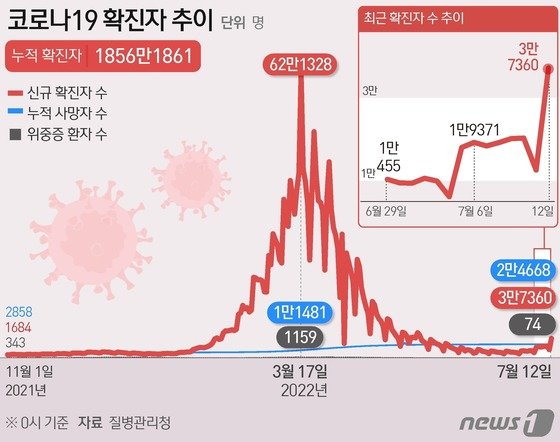 전날 기준 코로나19 일일 신규 확진자 수는 3만7360명을 기록했다. 이는 1주 전보다 약 2만명 증가한 규모이면서 지난 5월 중순 이후 62일 만에 최대치다.
