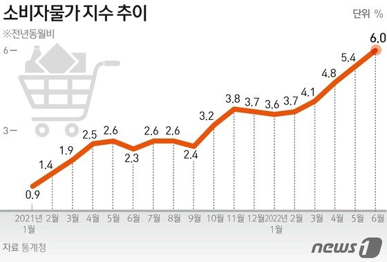 지난달 소비자물가 상승률은 외환위기 이후 24년 만에 가장 높은 6.0%를 나타냈다. 연간 물가 상승률은 정부 전망치인 4.7%를 넘어 5%대를 기록할 것으로 예상된다. 이달부터 연말까지 물가 상승률이 쭉 0%여도 연간 상승률은 4.7%에 이르기 때문이다.