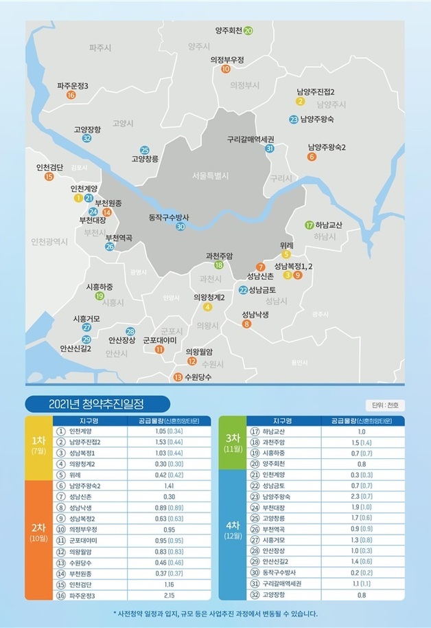 정부가 2차 사전청약을 통해 공급하는 지역별 물량은 △남양주 왕숙2 1412가구 △성남 신촌 304가구 △성남 낙생 884가구 △성남 복정2 632가구 △수원 당수 459가구 △의정부 우정 950가구 △군포 대야미 952가구 △의왕 월암 825가구 △부천 원종 374가구 △인천 검단 1161가구 △파주 운정3 2149가구 등이다.