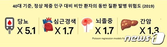 비만학회가 낸 ‘2021 비만 팩트시트’에 따르면 제2형 당뇨병의 경우, 비만 인구에서 정상 체중 인구 대비 그 발병 위험도가 2.6배 증가한다. 특히 젊은 연령일수록 그 증가가 뚜렷해 20~39세의 비만 환자는 제2형 당뇨병 발병 위험이 정상 체중의 5.9배에 달한다.