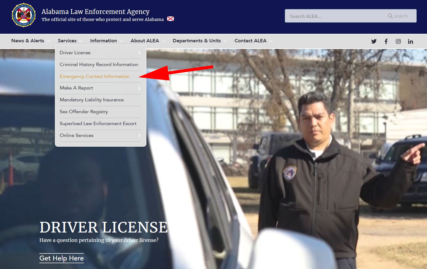 – 먼저 웹사이트 www.ALEA.gov 에 접속한 뒤, 메뉴에서 “Services > Emergency Contact”(서비스 > 비상 연락처)를 선택한다.