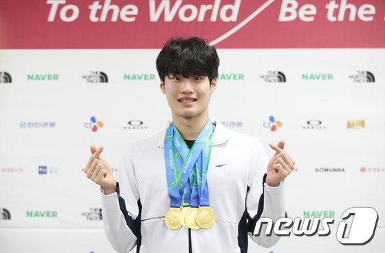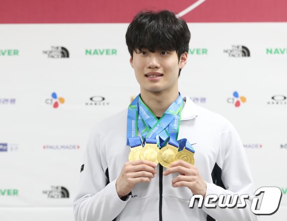 제103회 전국체육대회 MVP로 선정된 한국 수영의 간판 황선우(강원도청)가 13일 오후 울산시티컨벤션센터 프레스브리핑룸에서 열린 기자회견에서 금메달 4개를 목에 걸고 포즈를 취하고 있다. 4관왕을 차지한 황선우는 전국체전 마지막 경기에서 실격 판정을 받으며 2년 연속 대회 5관왕 달성은 아쉽게 무산됐다. 2022.10.13/뉴스1 © News1 윤일지 기자