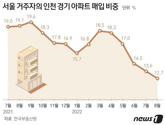매입 비중 감소폭은 인천보다 경기가 더 컸다. 서울 거주자의 최근 1년간 매입 비중은 경기는 2021년 8월 20.2%에서 2022년 8월 13%로 7.2%p, 인천은 같은 기간 14.3%에서 11.4%로 2.9%p 줄었다.