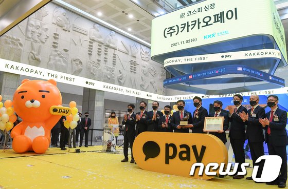 지난해 11월3일 서울 여의도 한국거래소에서 열린 카카오페이의 코스피 신규상장 기념식에 참석한 관계자들이 기념촬영을 하고 있다. (왼쪽부터) 송영훈 한국거래소 유가증권시장본부장보, 안상환 한국IR협의회 회장, 정형진 골드만삭스 서울지점 한국대표, 임재준 한국거래소 유가증권시장본부장, 손병두 한국거래소 이사장, 류영준 카카오페이 대표이사, 김주원 카카오 부회장, 장석훈 삼성증권 사장, 박태진 JP모간증권 한국총괄대표, 정우용 한국상장회사협의회 정책부회장. 2021.11.3/뉴스1 © News1 김명섭 기자