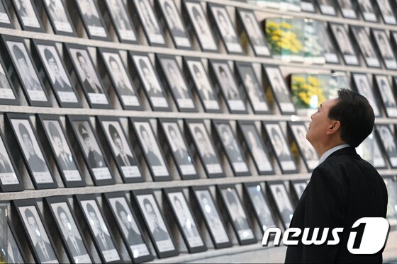 | 윤석열 대통령이 18일 광주 북구 국립5·18민주묘지에서 열린 제43주년 5·18민주화운동 기념식을 마친 후 유영봉안소를 둘러보고 있다. (대통령실 제공) 2023.5.18/뉴스1 © News1 오대일 기자 |
