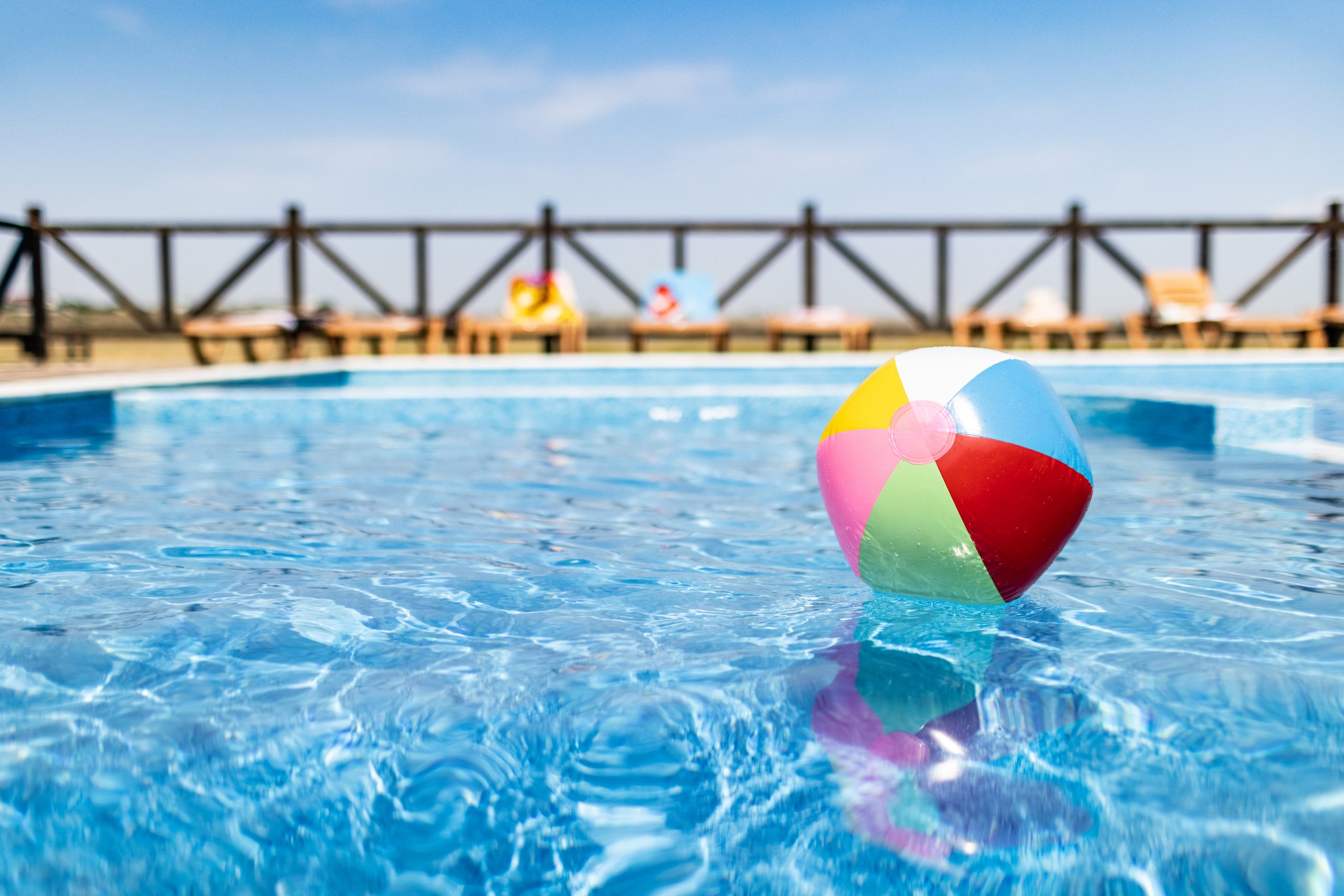 A bright inflatable multicolored ball floats on the surface of clean transparent water in a blue clear pool under the warm summer sun