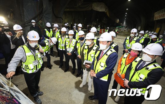 윤석열 대통령이 지난 5월2일 오전 경기 고양시 일산서구 대화동 GTX-A 터널구간 공사 현장을 찾아 관계자 설명을 경청하고 있다. 2022.5.2/뉴스1 © News1 인수위사진기자단