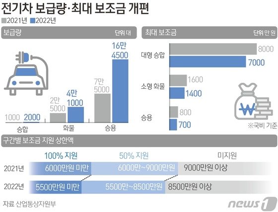 21일 업계에 따르면 정부는 ‘2022년 전기자동차 보조금 업무처리지침 개편안’을 통해 올해 1대당 받을 수 있는 보조금을 낮추는 대신 지원 물량을 2배 이상으로 확대했다.