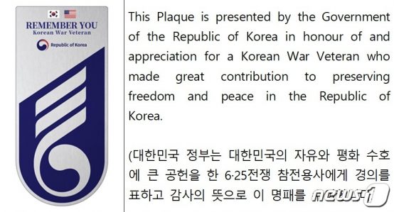 보훈처는 유엔(UN) 참전용사에게 경의를 표하고 감사의 뜻을 표하기 위해 ‘리멤버 유’ 명패를 제작했다. 1951∼1954년 해병대 소속 포병으로 6·25전쟁에 참전한 샘 필더 참전용사는 ‘리멤버 유’ 명패의 첫 번째 수여자가 될 전망이다.