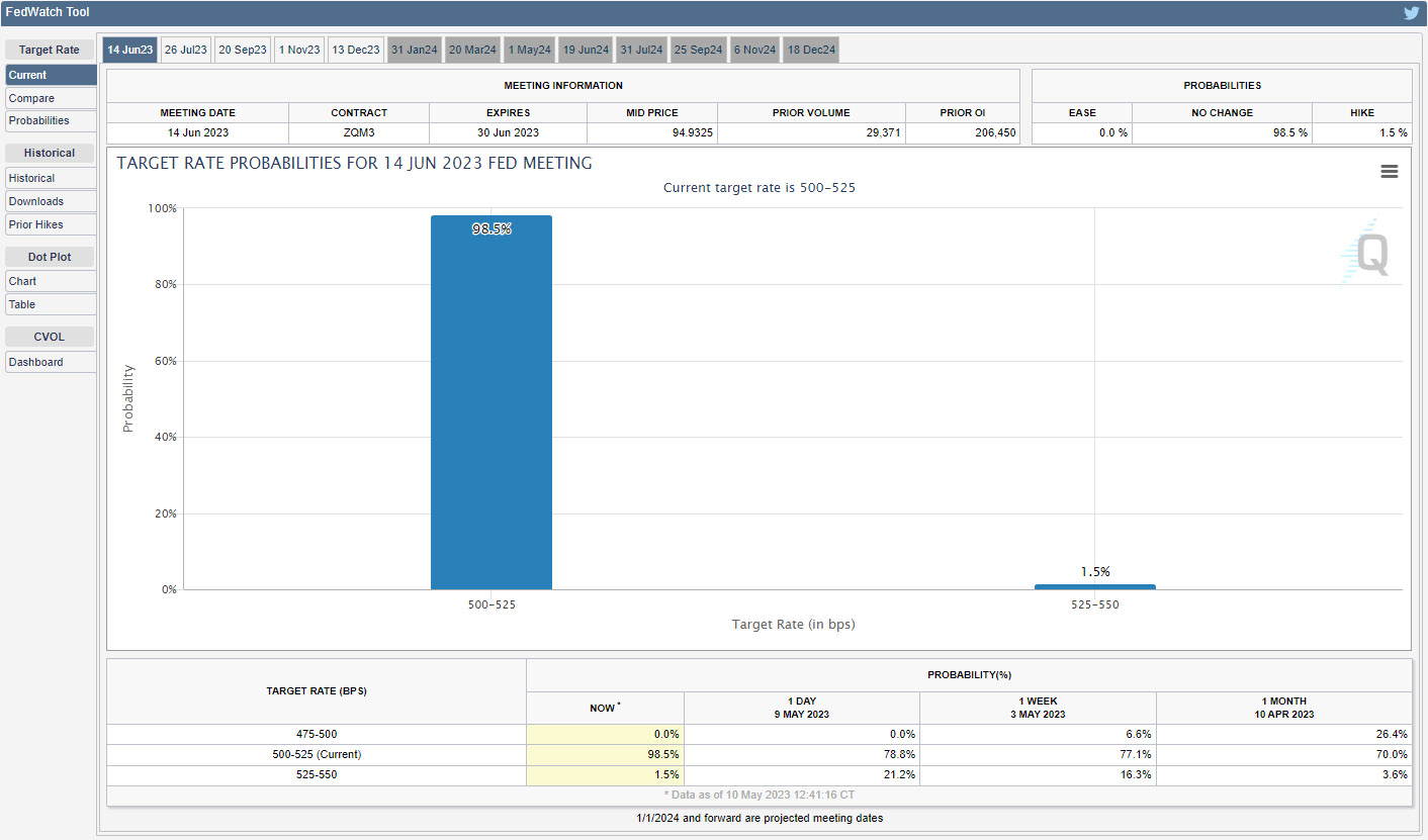 이날 4월 소비자물가지수(CPI)가 발표되기 이전 시장은 다음달 연준이 금리를 인상할 확률을 약 20%로 잡았다. 하지만 CPI 발표 이후 6월 인상확률은 6%로 떨어졌다.