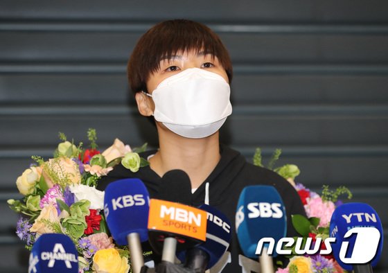 영국 여자프로축구 첼시 위민에서 활약하던 지소연이 19일 오후 인천국제공항을 통해 귀국하며 소감을 밝히고 있다. 2014년 첼시 위민에 입단해 유럽 무대에 도전장을 던졌던 지소연은 8년 동안의 영국 생활을 마무리하고 WK리그에서 활약할 계획이다. 2022.5.19/뉴스1 © News1 구윤성 기자