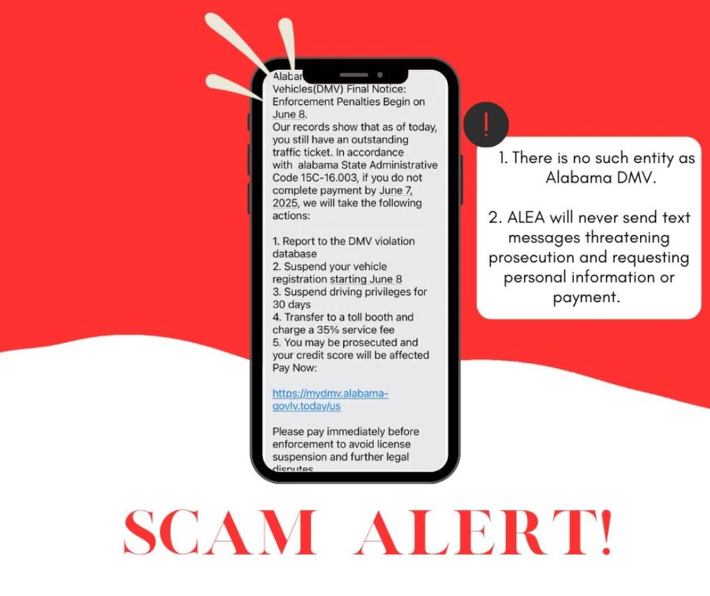 ALEA에 따르면, 이 피싱 문자 메시지들은 마치 앨라배마 차량국(Alabama Department of Vehicles)에서 보낸 것처럼 가장하며, 존재하지도 않는 교통 위반 티켓에 대한 벌금을 요구하고 있다는 것이다.