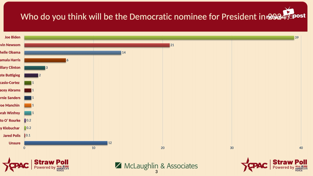 한편, 약 2천여명이 참여한 이날 여론조사에서 민주당 대선 후보고 바이든이 낙점될 것이라고 답한 응답자가 39%로 가장 많이 나왔고, 그 뒤로 21%를 차지한 개빈 뉴섬 캘리포니아 주지사, 미셸 오바마 전 영부인(14%), 카멀라 해리스 부통령(6%), 힐러리 클린턴(3%) 전 국무장관, 피트 부티지지 교통부장관(2%) 순으로 꼽았다.