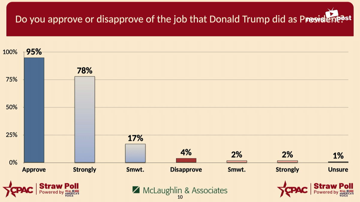 트럼프 전 대통령의 직무수행에 대한 지지율은 95%로 조사됐다. 이 수치는 2022년 8월 텍사스주 달라스에서 열린 행사에서 얻었던 99%와 같은해 2월 플로리다주 올랜도에서 얻었던 97%에 비해 다소 떨어진 것이다.