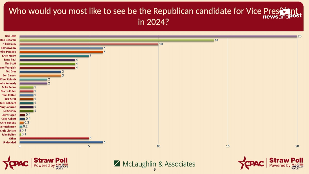 또한 트럼프가 공화당 대선 후보가 될 경우 부통령 러닝메이트로 누구를 선택할 것이냐는 질문에는 캐리 레이크(Kari Lake) 애리조나 주지사 후보(20%)를 1순위로 꼽았다. 그 뒤로 드산티스 주지사(15$), 니키 헤일리(10%), 라마스와미(6%), 폼페이오(6%), 크리스티 노엠 사우스다코타 주지사(5%) 등이 그 뒤를 이었다.