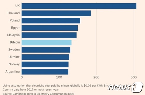비트코인 전기 소모량. 대국인 아르헨티나보다 많다 – FT 갈무리