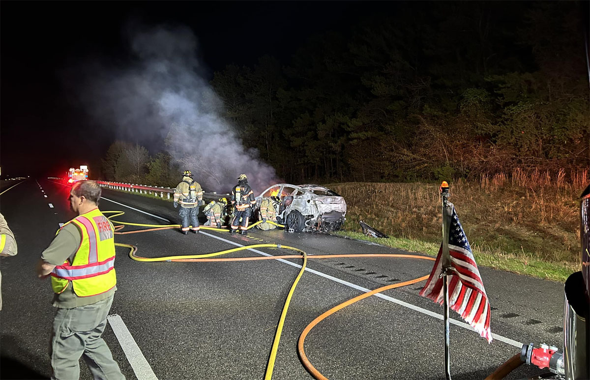 I-65 고속도로 선상에서 화재가 발생한 테슬라. (사진= 파인 레벨 소방서 페이스북 페이지)