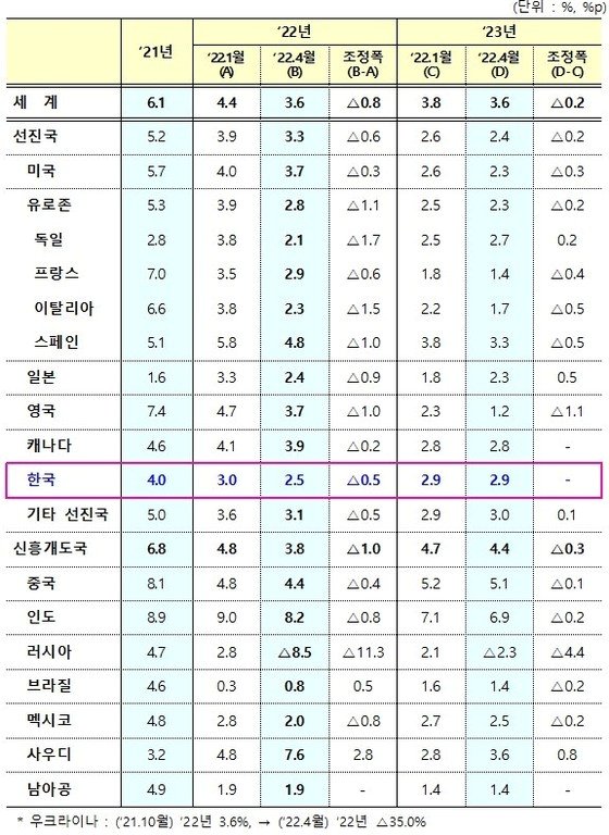 0.5%p↓, 주요국보다 소폭 하향…올해 물가전망 3.1→4.0% "전쟁 뒤 인플레 압력 증대 와중에도 상대적 회복" 평가