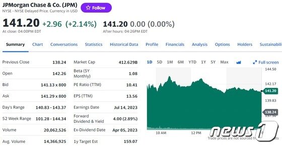 ◇ JP모간 주가도 2% 이상 상승 : JP모간의 주가도 2% 이상 상승했다. 이날 뉴욕증시에서 JP모간은 전거래일보다 2.14% 상승한 141.20 달러를 기록했다.