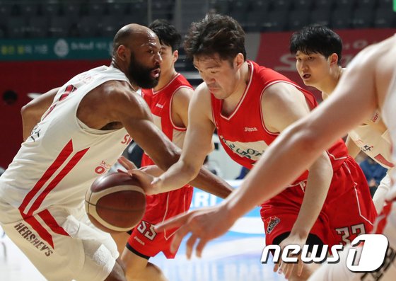 31일 오후 경기 고양시 일산서구 고양체육관에서 열린 ‘2021-22 KGC인삼공사 정관장 프로농구’ 고양 오리온과 서울 SK의 경기에서 오리온 이승현이 드리블을 하고 있다. 2022.3.31/뉴스1 © News1 김명섭 기자