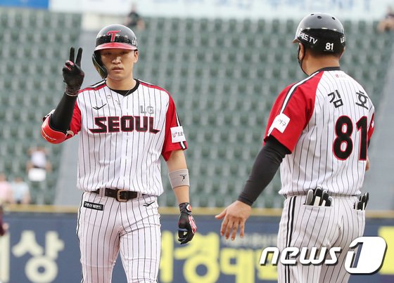 7일 오후 서울 송파구 잠실야구장에서 열린 프로야구 ‘2022 신한은행 SOL KBO리그’ 키움 히어로즈와 LG 트윈스의 경기 3회말 1사 주자 없는 상황 LG 박해민이 키움 애플러를 상대로 안타를 치고 세리머니를 하고 있다. 2022.8.7/뉴스1 © News1 임세영 기자