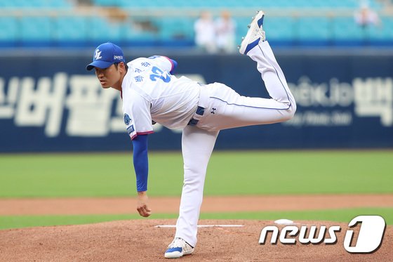 28일 오후 대구 삼성라이온즈파크에서 열린 프로야구 ‘2022 신한은행 SOL KBO리그’ KT 위즈와 삼성 라이온즈의 경기, 1회초 삼성 선발 백정현이 역투하고 있다. 2022.6.28/뉴스1 © News1 공정식 기자