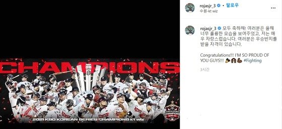 로하스는 19일 자신의 SNS에 KT의 통합우승 기념 사진을 올린 뒤 한글로 “모두 축하해! 여러분은 올해 너무 훌륭한 모습을 보여줬고, 저는 매우 자랑스럽습니다. 여러분은 우승반지를 받을 자격이 있습니다”라고 축하메시지를 적었다.