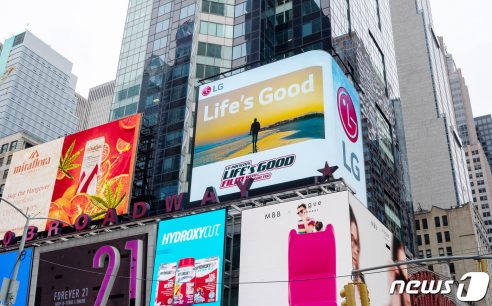 미국 뉴욕 타임스스퀘어에 있는 LG전자 전광판에 'Life's Good' 영화가 소개되고 있는 모습. (LG전자 제공)© 뉴스1