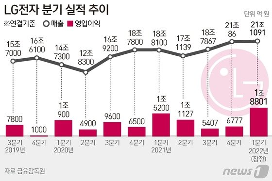 LG전자는 2022년 1분기 잠정 매출액이 전년 동기 대비 18.5% 증가한 21조1091억원을 기록했다고 7일 공시했다. 영업이익은 1조8801억원으로 전년 동기 대비 6.4% 증가했다.