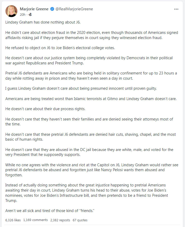 “린지 그레이엄은 J6에 대해 아무것도 하지 않았다”라고 그린은 시작했다. 그녀는 이전에 감옥에 수감된 폭동 피고인들을 방문했고 그들의 생활환경에 대해 지적한 바 있는 그린 의원은 갭(Gab.com)에 “법원에서의 하루를 기다리는 예비 미국인들에게 실제로 일어나고 있는 큰 불의에 대해 뭔가를 하는 대신, 린지 그레이엄은 그들의 남용에 고개를 돌리고, 조 바이든 후보에게 투표하고, 조 바이든의 인프라 법안에 투표하고, 그리고 나서 트럼프 대통령에게 친구 행세를 한다”고 썼다.