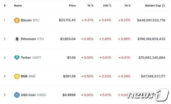 비트코인은 25일 오전 7시 현재(한국시간 기준) 글로벌 코인시황 중계사이트인 코인마켓캡에서 24시간 전보다 3.44% 급락한 2만3112 달러를 기록하고 있다.