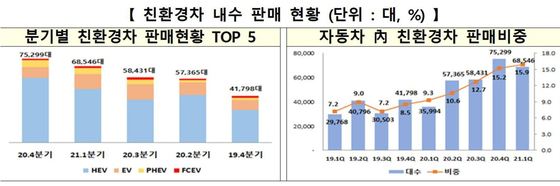 수출에서도 하이브리드는 올해 1분기 전체 수출 친환경차 판매량(9만1806대) 중 5만455대인 54.9%의 비중을 차지했다.