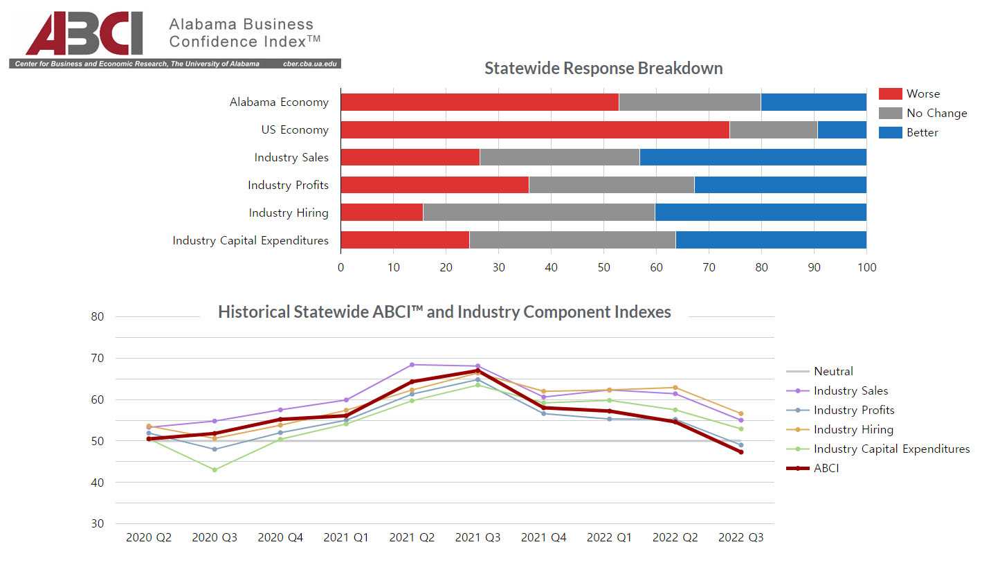 UA 기업·경제 연구센터(CBER)는 6월 초 앨라배마 기업 신뢰 지수(ABCI)를 측정했다. 그 결과, 재계 지도자들이 국가와 국가 경제에 대해 비관적인 전망을 가지고 있다는 것을 보여줬다. 이 조사에서 얻은 긍정적인 지표는 판매와 고용에 대해 적당한 낙관론을 시사했다는 점이다.